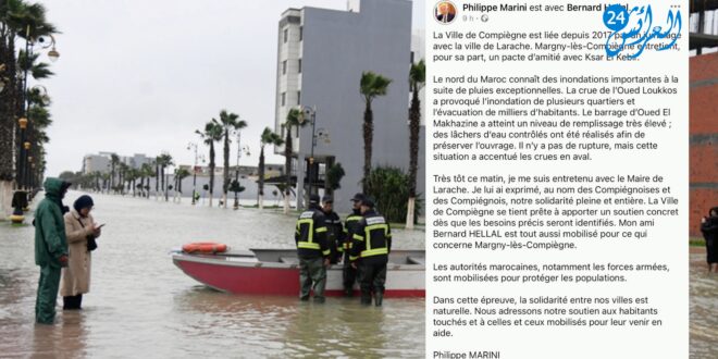 عبّر فيليب ماريني، عمدة مدينة كومبيين (Compiègne) الفرنسية، عن تضامنه الكامل مع مدينتي العرائش والقصر الكبير، على إثر الفيضانات القوية التي يشهدها الإقليم نتيجة التساقطات المطرية الاستثنائية وارتفاع منسوب وادي اللوكوس. وأوضح عمدة كومبيين، في منشور تضامني، أن مدينة العرائش ترتبط منذ سنة 2017 باتفاقية توأمة مع مدينة كومبيين، في حين تجمع مدينة القصر الكبير علاقة ميثاق صداقة مع بلدية …