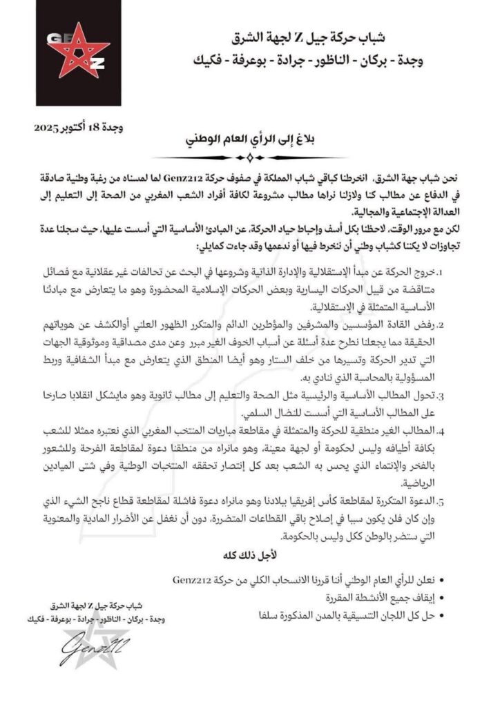 أعلنت تنسيقية شباب حركة جيل Z بجهة الشرق، التي تضم مدن وجدة، بركان، الناظور، جرادة، بوعرفة، وفكيك، في بلاغ موجه إلى الرأي العام الوطني، عن انسحابها الكامل من حركة “Genz212”، مع حل جميع لجانها التنسيقية الجهوية وإيقاف أنشطتها المقررة.