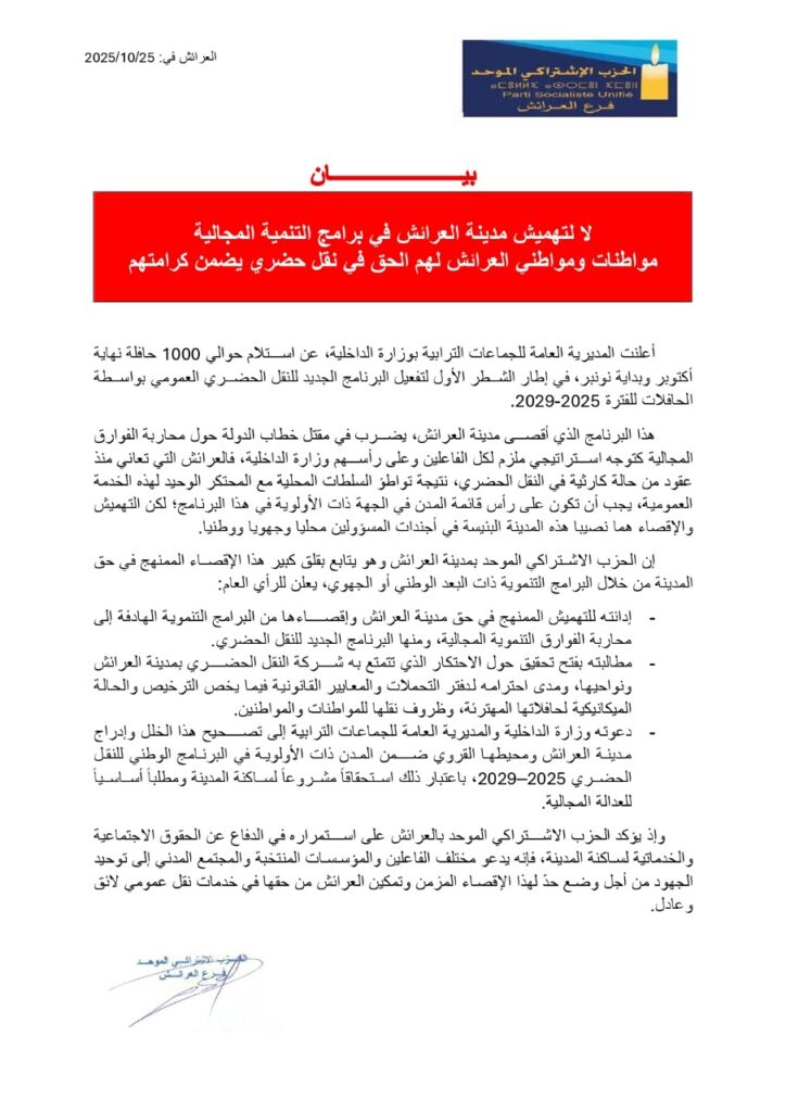 عبّر الحزب الاشتراكي الموحد بمدينة العرائش عن استنكاره الشديد لإقصاء المدينة من الشطر الأول للبرنامج الوطني للنقل الحضري العمومي بواسطة الحافلات، الذي أعلنت عنه المديرية العامة للجماعات الترابية بوزارة الداخلية، والذي يشمل استلام حوالي 1000 حافلة بين نهاية أكتوبر وبداية نونبر 2025 في إطار تنفيذ البرنامج الممتد ما بين 2025 و2029.