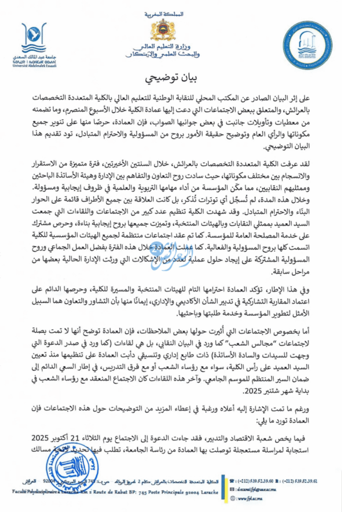 أصدرت عمادة الكلية المتعددة التخصصات بالعرائش بياناً توضيحياً رداً على البيان السابق الصادر عن المكتب المحلي للنقابة الوطنية للتعليم العالي، والذي تناول بعض الاجتماعات التي عقدتها العمادة خلال الأسبوع الماضي. وجاء البيان التوضيحي لتسليط الضوء على ما وصفته العمادة بـ”معطيات وتأويلات جانبت الصواب” في بيان النقابة.