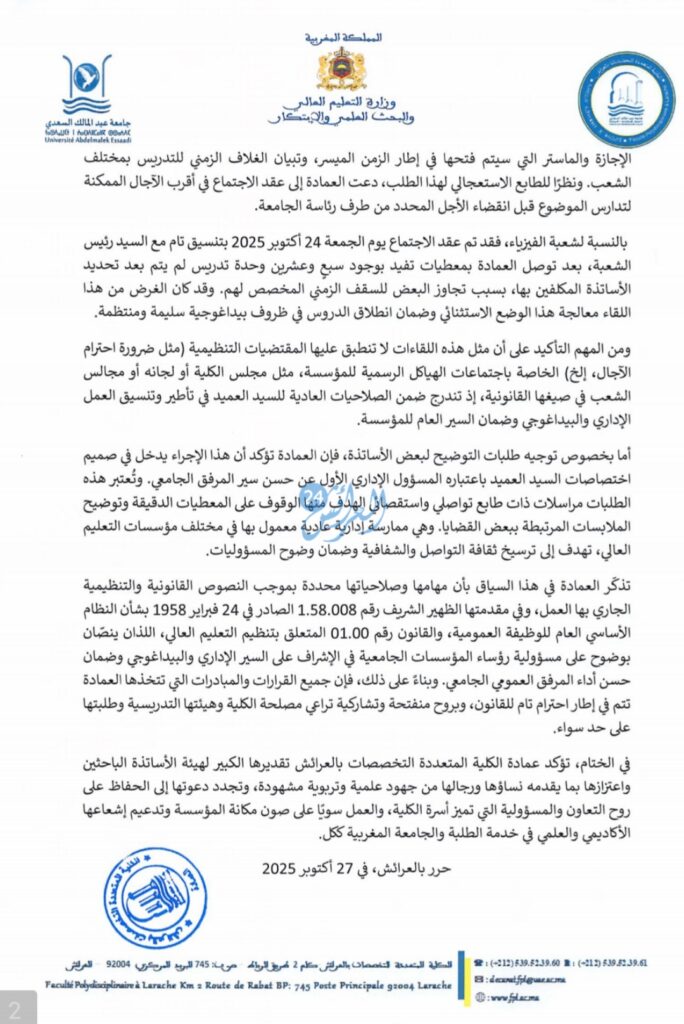 وفيما يخص تفاصيل الاجتماعات المذكورة، أفادت العمادة بأن اجتماع شعبة الاقتصاد والتدبير عُقد استجابة لمراسلة مستعجلة من رئاسة الجامعة، بينما جاء اجتماع شعبة الفيزياء لمعالجة وضع استثنائي يتعلق بتحديد الأساتذة المكلفين بوحدات تدريسية.