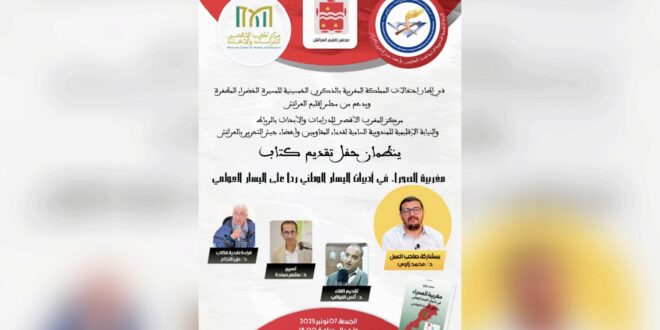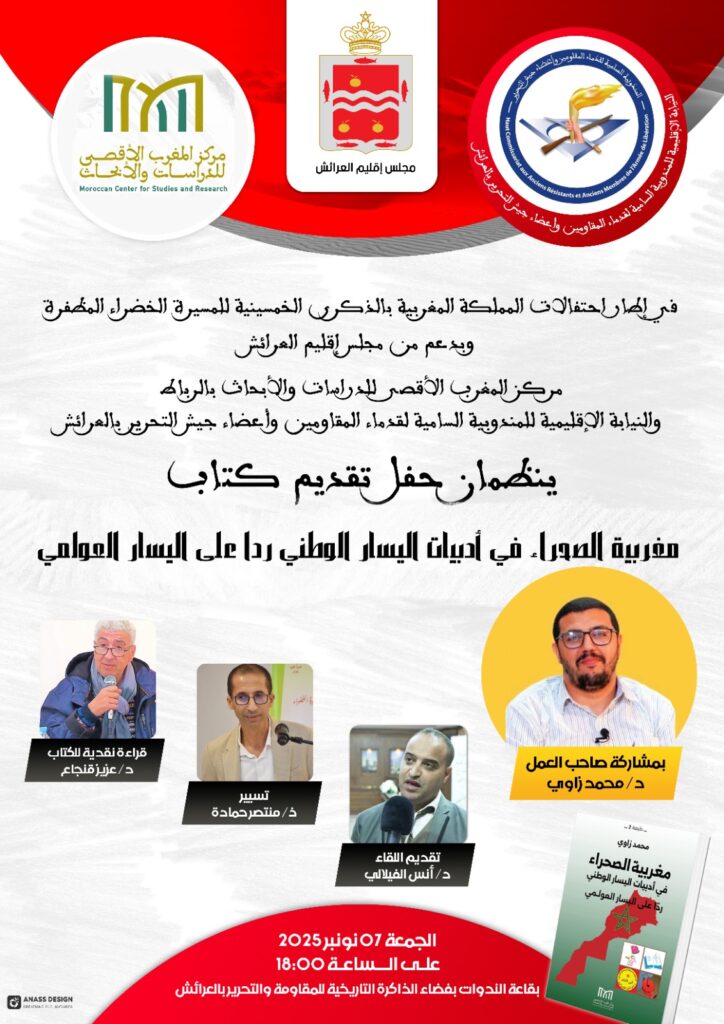 في إطار احتفالات المملكة المغربية بالذكرى الخمسين للمسيرة الخضراء المظفرة، وبـدعم من مجلس إقليم العرائش، ينظم مركز المغرب الأقصى للدراسات والأبحاث بالرباط، بشراكة مع النيابة الإقليمية للمندوبية السامية لقدماء المقاومين وأعضاء جيش التحرير بالعرائش، يوم غدٍ الجمعة 7 نونبر 2025، لقاءً ثقافيًا لتقديم كتاب “مغربية الصحراء في أدبيات اليسار الوطني.. ردًّا على اليسار العولمي”، وذلك بفضاء الذاكرة التاريخية للمقاومة والتحرير بالعرائش ابتداءً من الساعة السادسة مساءً.