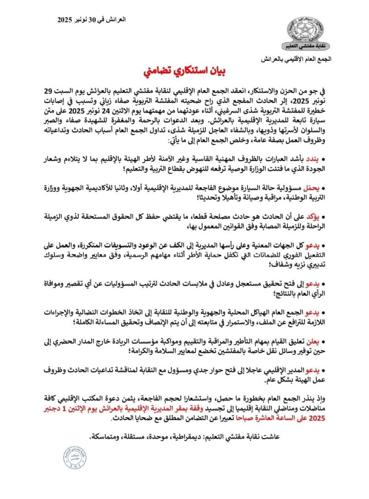 ودعا البلاغ أيضاً إلى اتخاذ خطوات استعجالية لضمان توفير وسائل نقل حديثة وآمنة لمفتشي التعليم، وإعادة النظر في آليات اشتغالهم الميدانية بما يحفظ سلامتهم وكرامتهم.