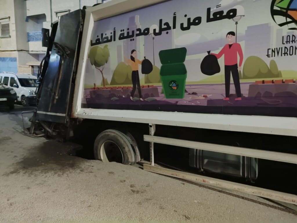 شهد حي تجزئة الخضراء بمدينة العرائش، مساء اليوم، حادثاً مثيراً للقلق بعد أن انهارت قطعة من الطريق بشكل مفاجئ، ما أدى إلى سحب إحدى عجلات شاحنة جمع النفايات التابعة لشركة النظافة نحو حفرة عميقة تشكّلت بشكل آني تحت المركبة. ورغم عدم تسجيل خسائر بشرية، فقد خلّف الحادث صدمة في أوساط الساكنة، التي اعتبرت ما وقع إنذاراً خطيراً للوضعية المتدهورة للبنية التحتية بالحي.