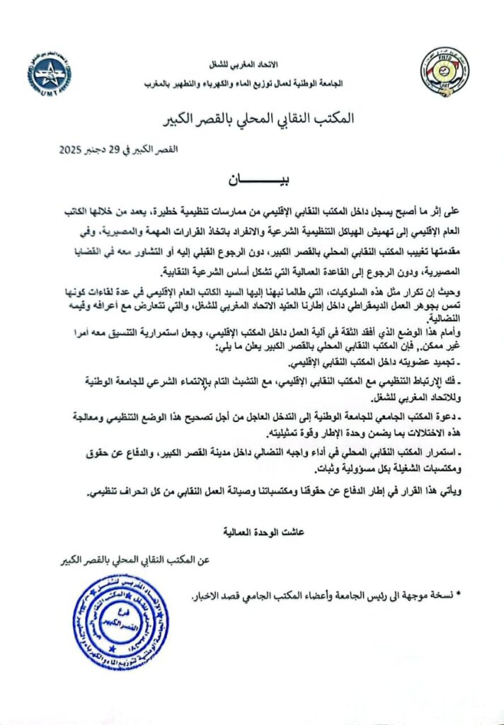 أعلن المكتب النقابي المحلي بالقصر الكبير، التابع للجامعة الوطنية لعمال توزيع الماء والكهرباء والتطهير بالمغرب المنضوية تحت لواء الاتحاد المغربي للشغل، عن اتخاذ سلسلة من القرارات التنظيمية الحاسمة، احتجاجاً على ما وصفه بـ«ممارسات تنظيمية خطيرة» داخل المكتب النقابي الإقليمي بالعرائش.