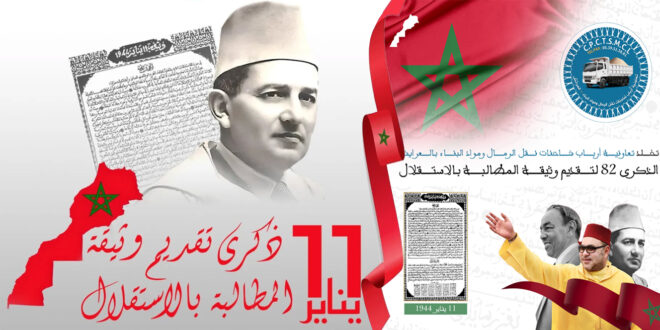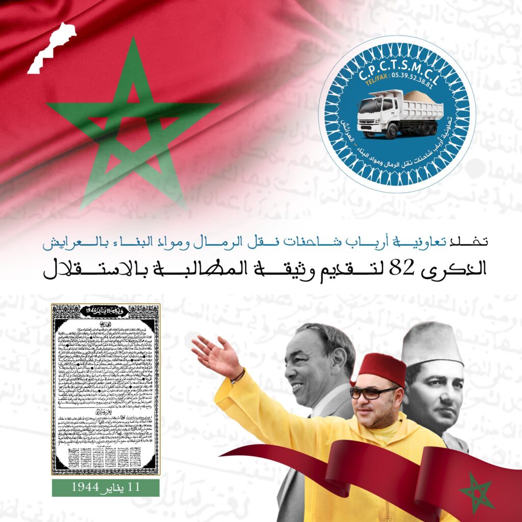 بمناسبة الذكرى الثانية والثمانين (82) لتقديم وثيقة المطالبة بالاستقلال، يتشرف “مصطفى بنحمدان ” رئيس تعاونية شاحنات نقل الرمال ومواد البناء بأن يرفع أسمى عبارات التهاني وأصدق مشاعر الولاء والإخلاص إلى السدة العالية بالله، صاحب الجلالة الملك محمد السادس نصره الله وأيده، سائلين المولى عز وجل أن يديم على جلالته موفور الصحة والعافية، وأن يقر عينه بولي عهده صاحب السمو الملكي الأمير الجليل مولاي الحسن، ويشد أزره بصنوه السعيد صاحب السمو الملكي الأمير مولاي رشيد، وأن يحفظ الأسرة العلوية الشريفة بما حفظ به الذكر الحكيم.