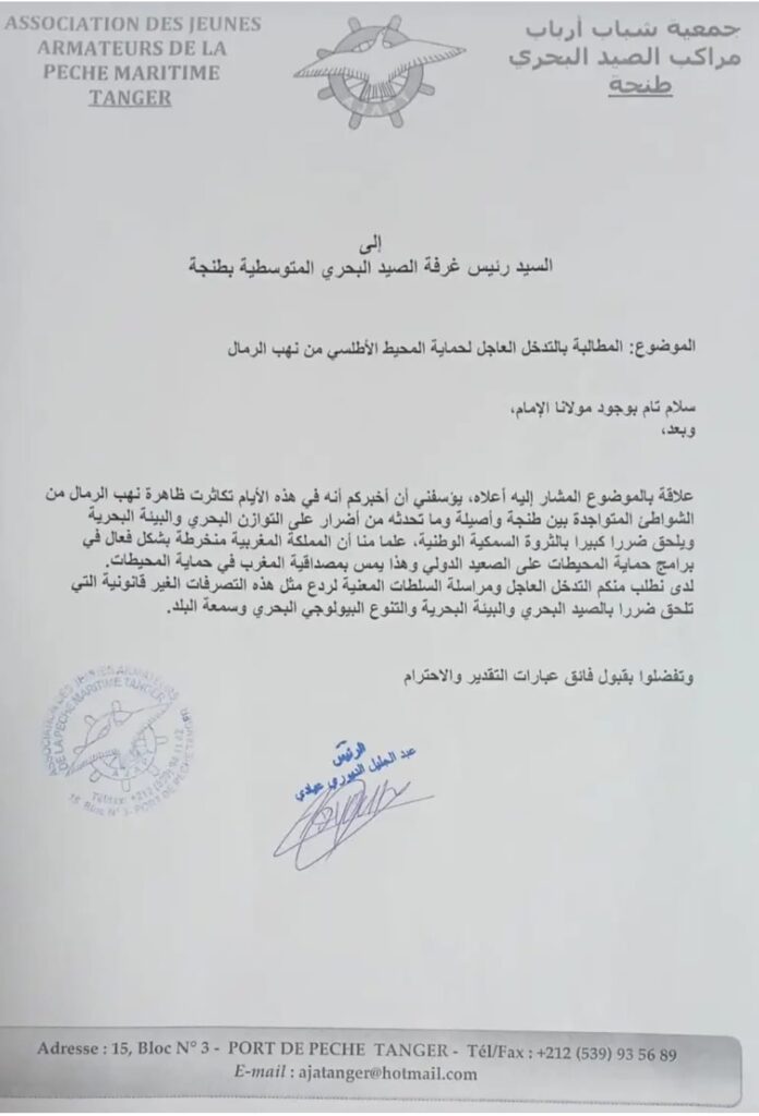 وأفادت الغرفة، في مراسلة رسمية وجهتها إلى السيد والي الجهة بتاريخ 15 يناير 2026، أنها توصلت بعدة شكايات ومراسلات من مهنيين وفاعلين بالقطاع، تندد بما وصفته بـ“الأفعال الإجرامية” المرتبطة بالاستخراج العشوائي وغير المرخص للرمال، خاصة بالمجال الساحلي الممتد بين مدينة طنجة ومنطقة تهدارت.