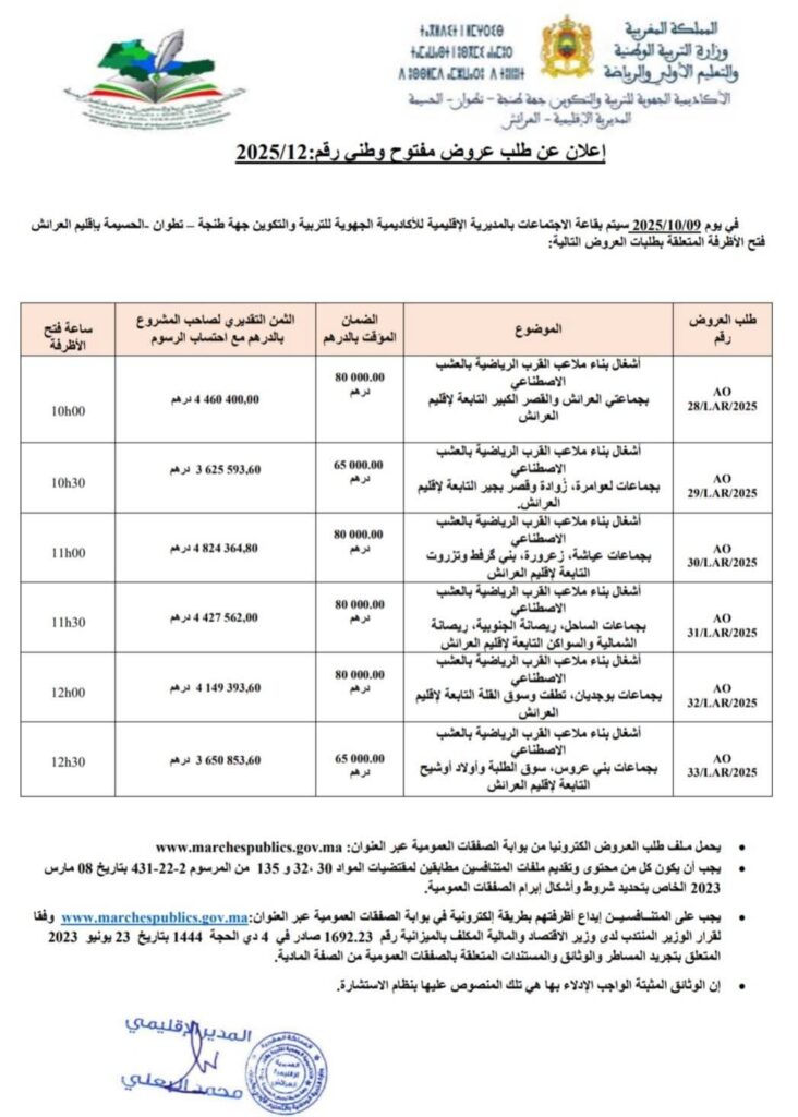 أعلنت الأكاديمية الجهوية للتربية والتكوين بجهة طنجة تطوان الحسيمة، عبر المديرية الإقليمية بإقليم العرائش، عن طلب عروض مفتوح وطني رقم 12/2025، يهم إنجاز عدد من المشاريع التربوية والرياضية على مستوى الإقليم.