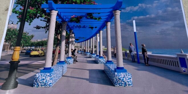 وخلال اللقاء، تقرر الشروع في إنجاز العريشة المقوسة المقابلة للقنصلية الإسبانية وفق التصميم المصادق عليه مسبقًا، والمتكون من 32 عمودًا وكراسٍ إسمنتية مزينة بالزليج الأبيض والأزرق وعريشة خشبية باللون الأزرق، مع اعتماد نفس الشكل للعريشات الأربع الأخرى بالجهة الوسطى.